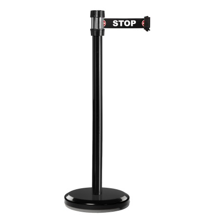 Strap post for guiding the public and regulating traffic. The post has a weighted base and a 2m long, 5cm wide strap. The strap itself has a braking and anti-panic system that allows it to automatically detach in case of emergency. The head of the post can accommodate up to 6 different straps and has a threaded hole for attaching an information panel. For indoor use only. A wide range of options is available: information panel, wall receiver, and strap customization.