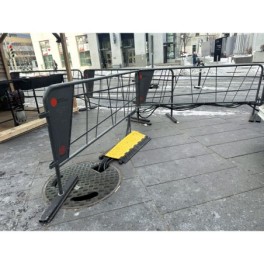 Temporary antislip manhole cover with a diameter of 600 mm, designed to cover manhole openings during maintenance operations to protect operators from accidents on work sites. Made from low-density linear polyethylene, it can withstand heavy loads of up to 150 kg and temperatures ranging from -40 to +60 °C.