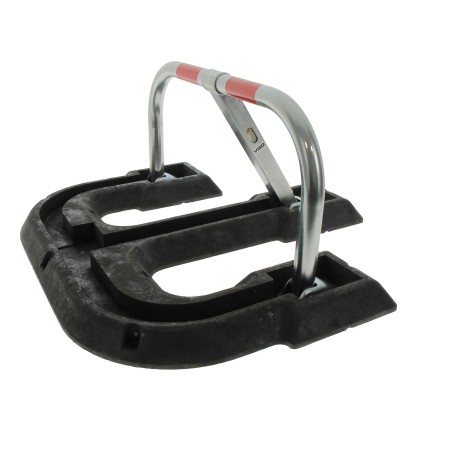 Rubber-mounted structure with Ø50 mm parking bollard designed to reserve a parking space. The mounting structure protects the bollard when lowered, preventing damage from passing vehicles. Includes 2 anti-friction polypropylene rings and 2 Class 1 red reflective strips. The bollard is secured into the structure and to the ground with the included fixings.