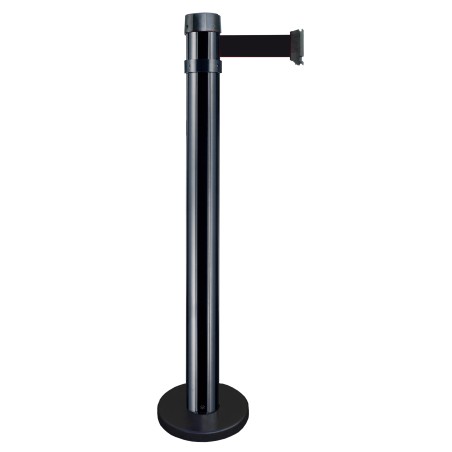 Poteau à sangle permettant de guider le public et de réguler le trafic. Le poteau possède une base à fixer et une sangle de 4 m de longueur sur 5 cm de largeur. La sangle quant à elle, possède un système de freinage et anti panique qui permet de décrocher automatiquement la sangle en cas d'urgence. La tête du poteau peut recevoir jusqu'à 6 sangles différentes et possède un trou fileté pour accrocher un panneau d'information. Usage intérieur uniquement. Un large choix d'option est disponible : panneau d'information, récepteur mural et de personnalisation de sangle.
