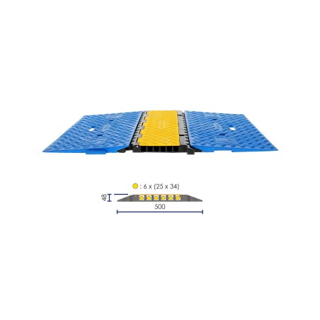 Ce kit complet comprend un passe-câbles robuste en caoutchouc avec couvercle jaune haute visibilité, doté de 6 canaux ø 25x34mm ainsi qu’une rampe PMR pour un accès sécurisé aux personnes à mobilité réduite. Faciles à transporter et à assembler grâce à leurs poignées et systèmes d’imbrication par queues d’aronde inversées, tous les éléments s’installent rapidement avec leurs points de fixation dédiés. Idéal pour sécuriser les zones de passage tout en protégeant efficacement câbles et tuyaux.Les deux embouts (gauche et droit) sont en option