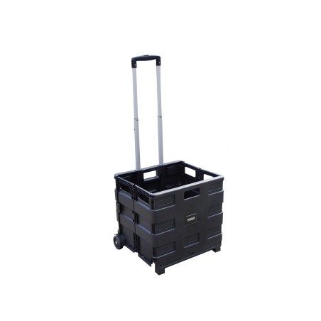 Caisse pliante en polypropylène avec poignée télescopique et deux roues pour un transport facile des charges jusqu’à 35 kg.