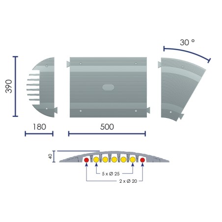 Passe-câble permettant de protéger les câbles et tuyaux lors d'une utilisation temporaire. Possède 7 canaux : Ø 5x25 mm et 2x20mm. Utilisation temporaire. Résiste aux passages de véhicules jusqu'à 1T par essieu. Queues d'arondes inversées.